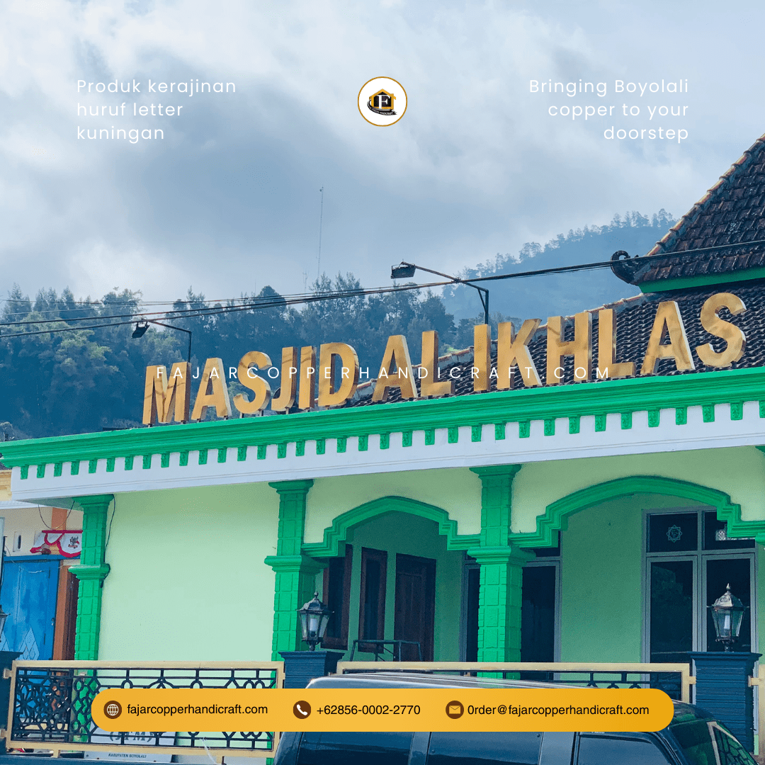 Huruf letter kuningan Fajar Copper Handicraft dibuat dari bahan premium dengan proses manual presisi oleh pengrajin berpengalaman. Kuningan tahan karat dan cuaca ekstrem, sehingga cocok untuk outdoor signage seperti toko, kantor, atau gedung masjid. Warna kilau emas kuningan memberikan kesan mewah yang tak lekang waktu
